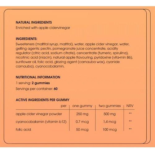 According to the product information, each daily dose (2 chewable sweets) provides: Apple cider vinegar powder 500 mg, vitamin B12 (cyanocobalamin) 1.4 Β΅g and folic acid (folate) 100 Β΅g. Other ingredients: sweeteners (maltitol syrup, maltitol), water, apple cider vinegar, gelling agent pectin, pomegranate juice concentrate, acidity regulators (citric acid, sodium citrate), colouring and plant concentrates (turmeric, spirulina), nicotinic acid (niacin), natural apple flavouring, pyridoxine (vitamin B6), sunflower oil, coating agent (carnauba wax). The recipe is therefore based on a fruity chewable sweet format with pectin.